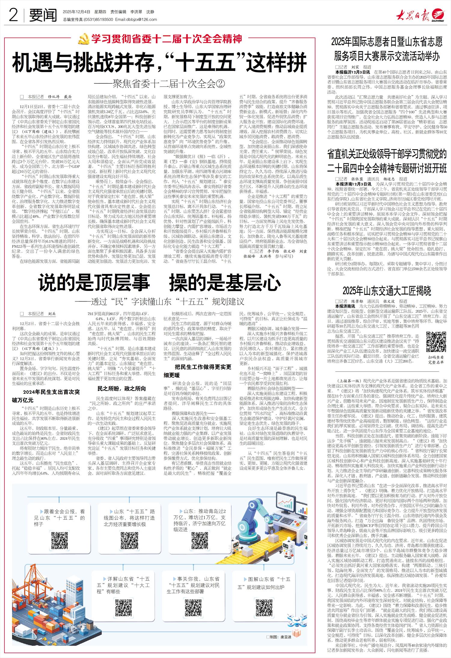 12月1日至2日,省委十二届十次全会召开。会议高度评价了“十四五”时期山东发展取得的重大成就,审议通过了《中共山东省委关于制定山东省国民经济和社会发展第十五个五年规划的建议》(以下简称《建议》),系统擘画了未来五年山东经济社会发展的宏伟蓝图,在全省各界引发热烈反响。
