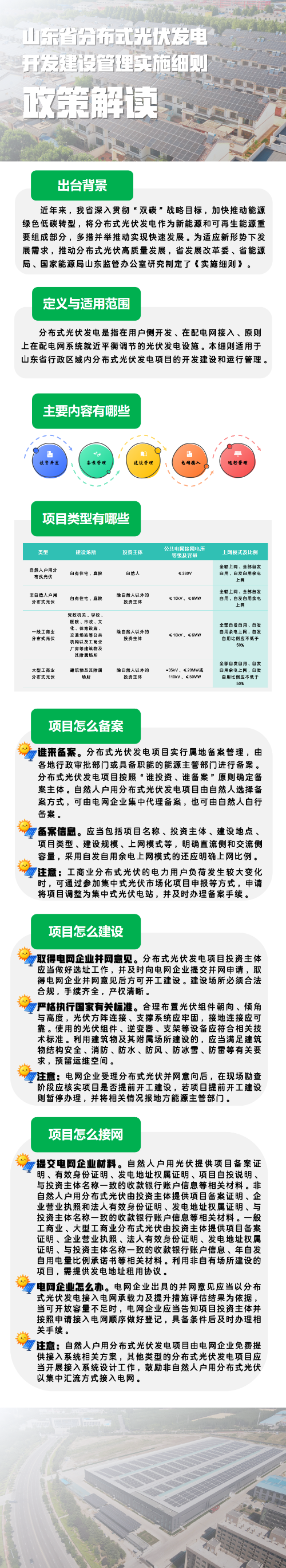 近年来,我省深入贯彻“双碳”战略目标,加快推动能源绿色低碳转型,将分布式光伏发电作为新能源和可再生能源重要组成部分,多措并举推动实现快速发展。截至2024年底,全省分布式光伏装机达5020.6万千瓦,连续多年位居全国前列。随着分布式光伏发电快速发展和电力市场化改革加速推进,行业环境发生了较大变化。为适应新形势下发展需求,推动分布式光伏高质量发展,省发展改革委、省能源局、国家能源局山东监管办公室研究制定了《实施细则》。