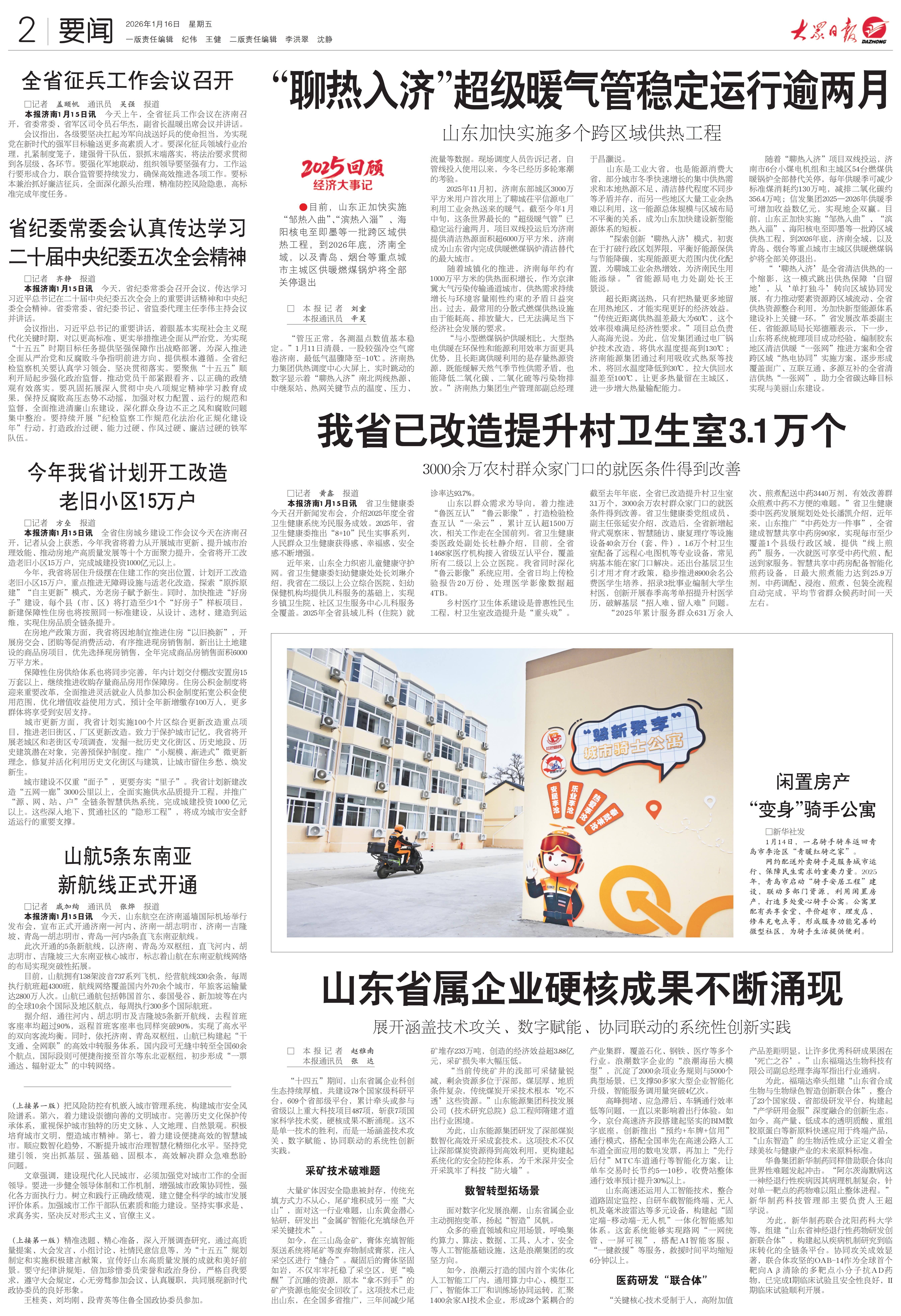 ●目前,山东正加快实施“邹热入曲”、“滨热入淄”、海阳核电至即墨等一批跨区域供热工程,到2026年底,济南全域,以及青岛、烟台等重点城市主城区供暖燃煤锅炉将全部关停退出